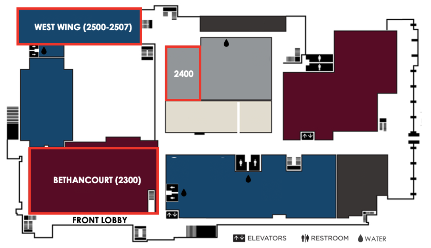 *Main hacking location will be in the Bethancourt Ballroom (room 2300), quiet hacking in room 2400, and workshops in West Wing